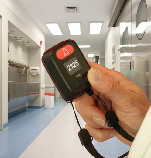 Wireless wrist alert button activates TWIG duress alert from 20 metres